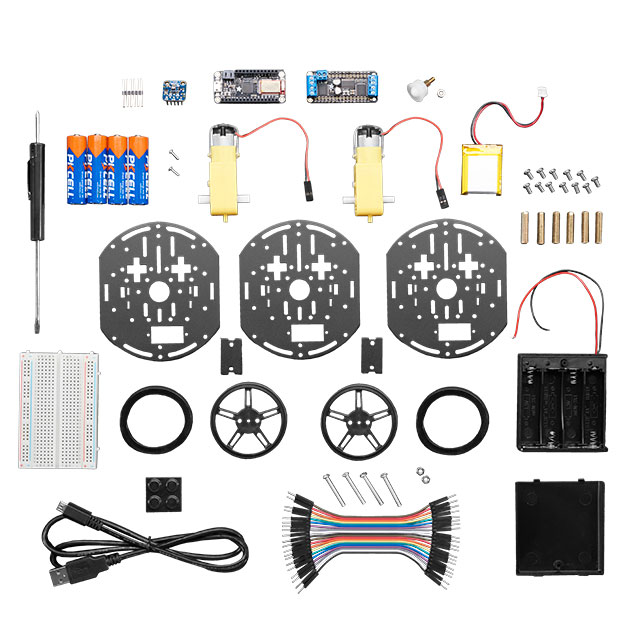 Įeina MCU / MPU valdyba (-os) Adafruit Feather 32u4 Bluefruit LE Turinys Board(s), Chassis, Components, Hardware, Motor(s), Wheel(s)