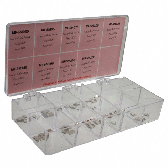 Apima - Išsamus aprašymas PTC Resettable Fuse Kit 0.3 ~ 2.6 A 15 ~ 60 VDC Surface Mount 45 Pieces (9 Values - 5 Each)