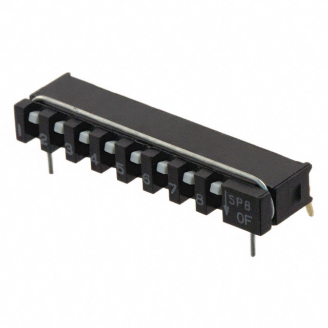 Išsamus aprašymas Dip Switch SPST 8 Position Through Hole, Right Angle Slide (Standard) Actuator 10mA 20VDC Dabartinis įvertinimas 10mA