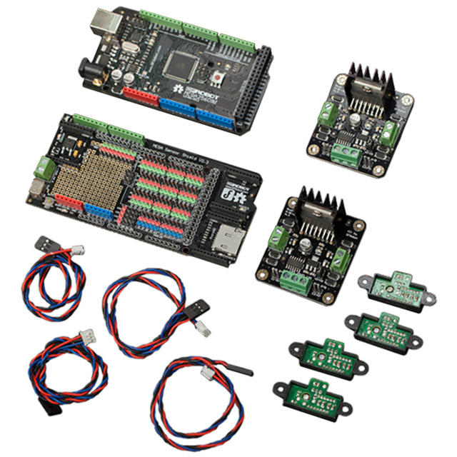 Įeina MCU / MPU valdyba (-os) DFRduino Mega 2560 V3.0 Turinys Board(s), Components, Motor(s)