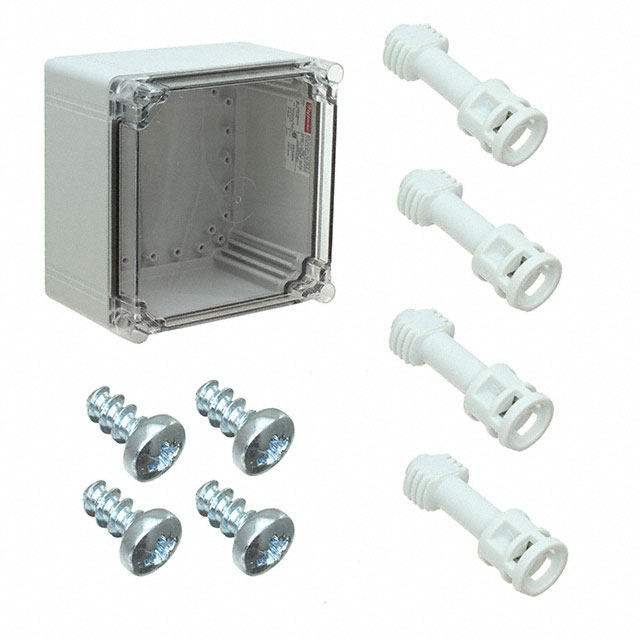 Išsamus aprašymas Box Plastic, Polycarbonate Gray, Clear Cover/Door Cover Included 7.874" L x 7.874" W (200.00mm x 200.00mm) X 5.157" (131.00mm) Dizainas Cover Included