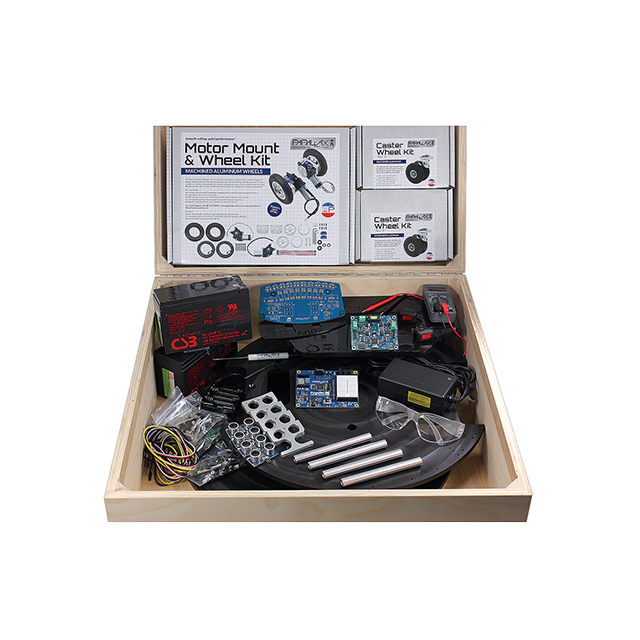 Įeina MCU / MPU valdyba (-os) Propeller Activity Board WX Turinys Board(s), Chassis, Components, Hardware, Motor(s), Wheel(s)