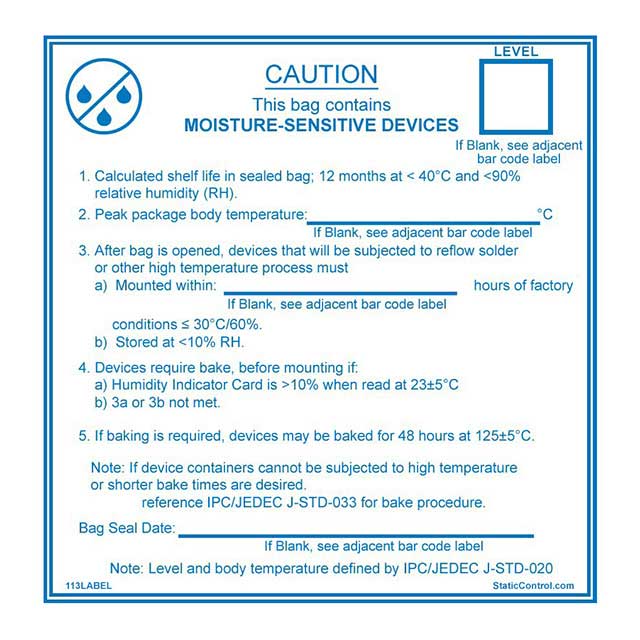 | Etiketės tipas | Moisture Warning Label | Etiketės dydis | 4.00" L x 4.00" W (101.6mm x 101.6mm) |